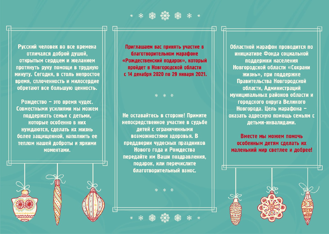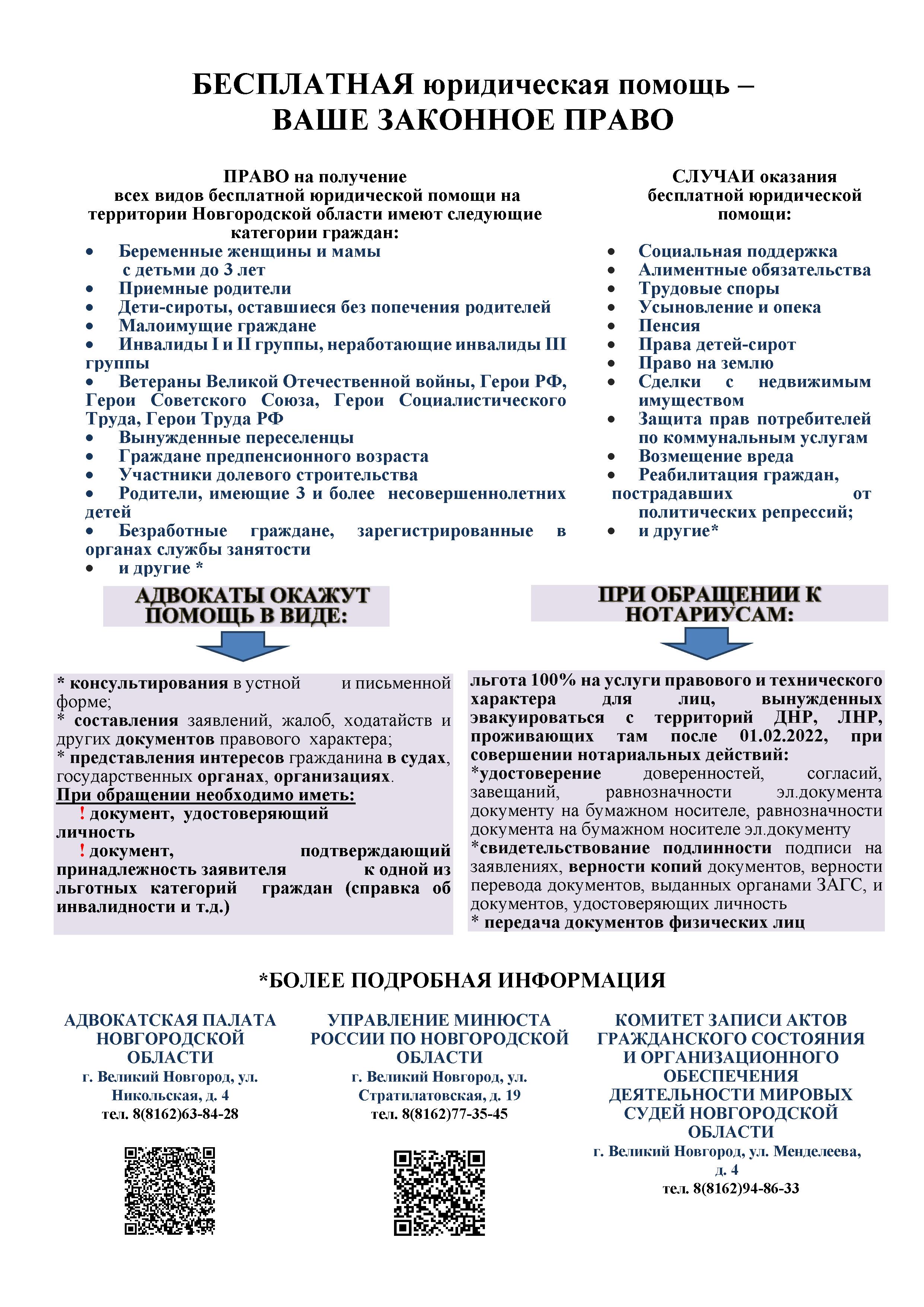 В рамках 30-го областного благотворительного марафона «Рождественский подарок» комитетом записи актов гражданского состояния и организационного обеспечения деятельности мировых судей Новгородской области совместно с Адвокатской палатой Новгородской области в рамках участия в акции «Календарь добрых дел» организовано проведение юридических консультаций для женщин, находящихся в трудной жизненной ситуации.