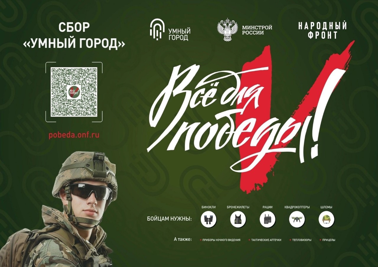 Акция Сбор «Умный город» помогает поддержать бойцов СВО и мирных жителей новых и приграничных регионов. Совместно с Народным Фронтом в рамках проекта «Все для Победы!» Минстрой России реализует акцию Сбор «Умный город».