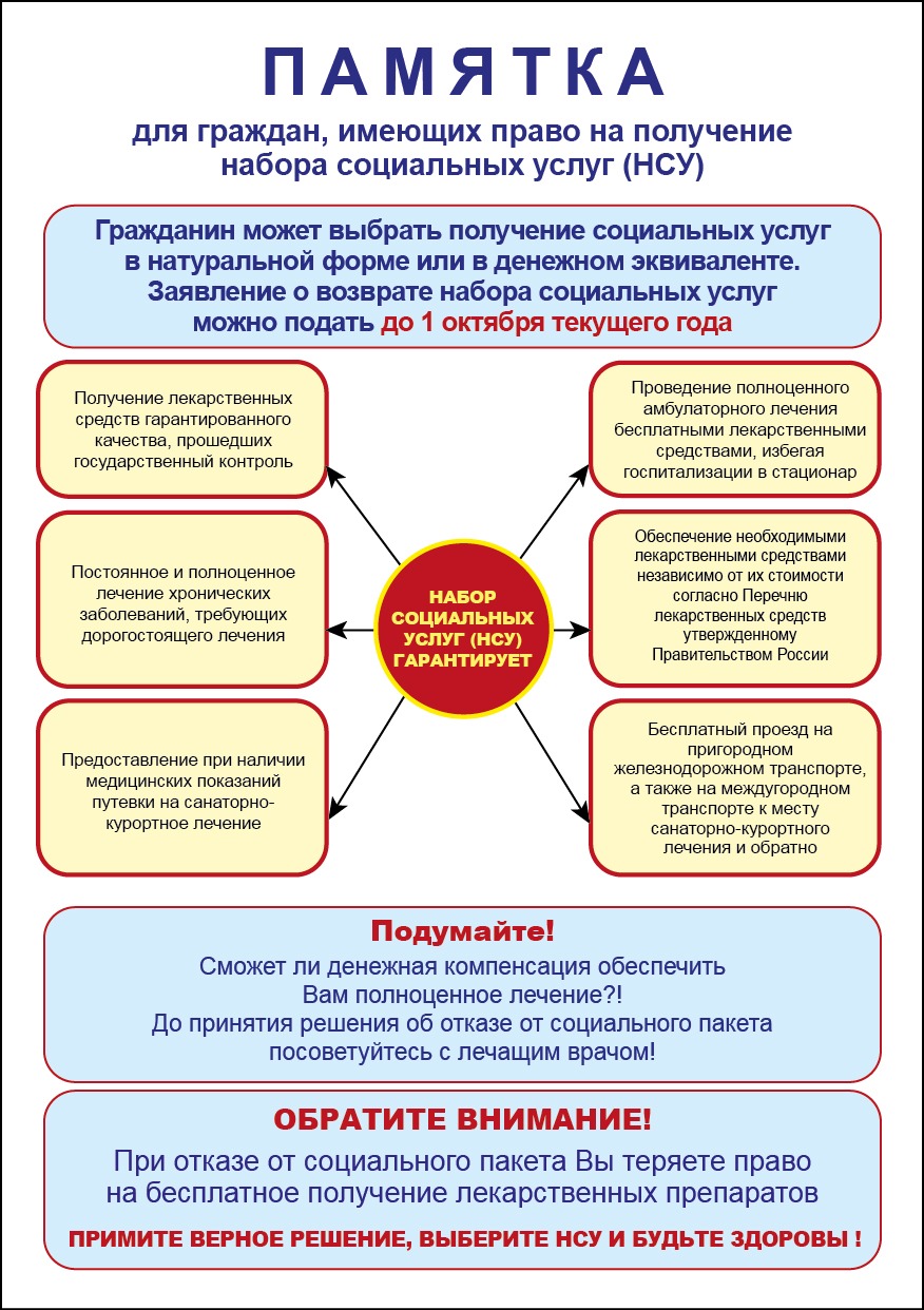 Если ранее Вами был сделан выбор в пользу денежной компенсации и Вы, как это нередко случается, убедились, что он был неправильным, Вам необходимо знать: Восстановить право на получение набора социальных услуг возможно только после подачи соответствующего заявления в Пенсионный фонд не позднее 1 октября текущего года. После этой даты право на получение набора социальных услуг в течение целого года возобновить будет невозможно (законодательством Российской Федерации это не предусмотрено).