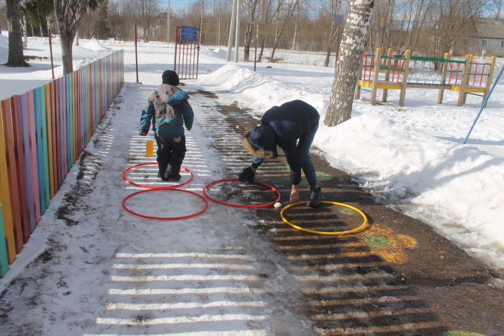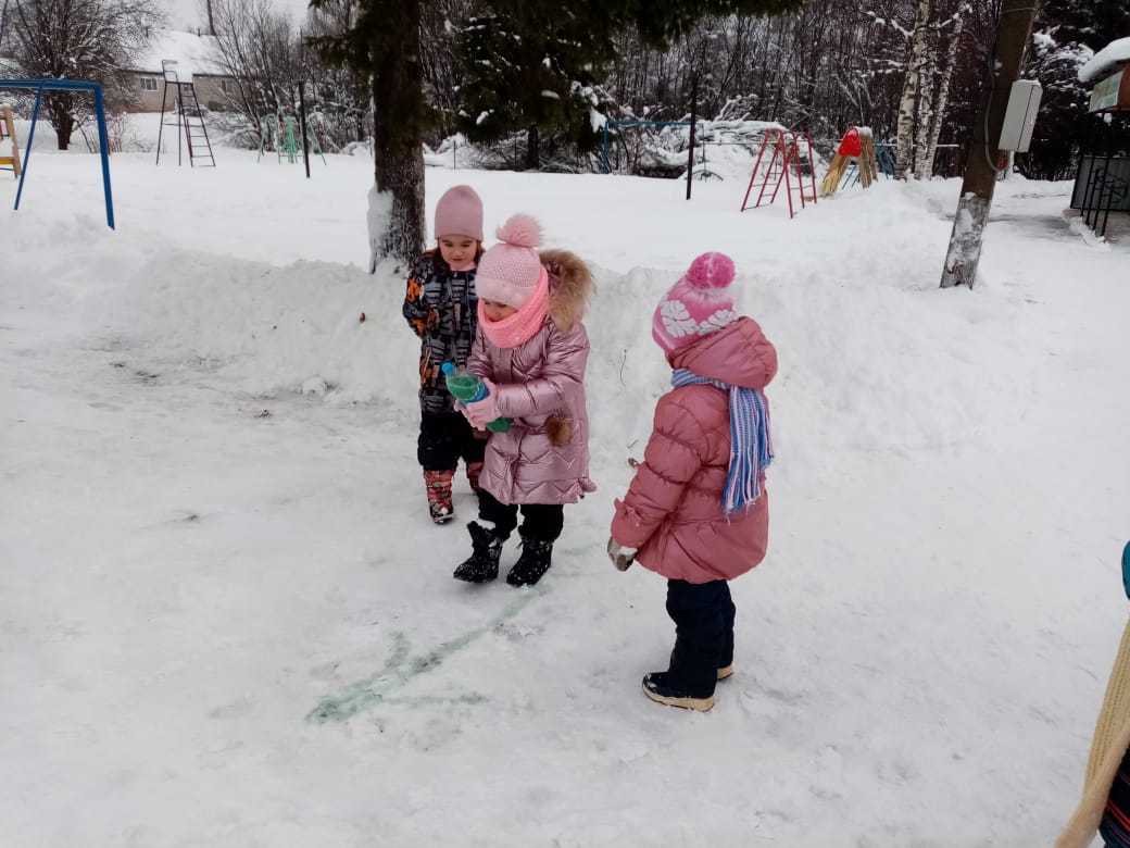 Фантазию и сообразительность малыши проявили в конкурсе «Рисунки на снегу». Каждой команде выдано по бутылке с цветной водой (зеленой и голубой). Ребята должны были нарисовать соответствующие этим цветам предметы (например, елку, снежинку и др.).