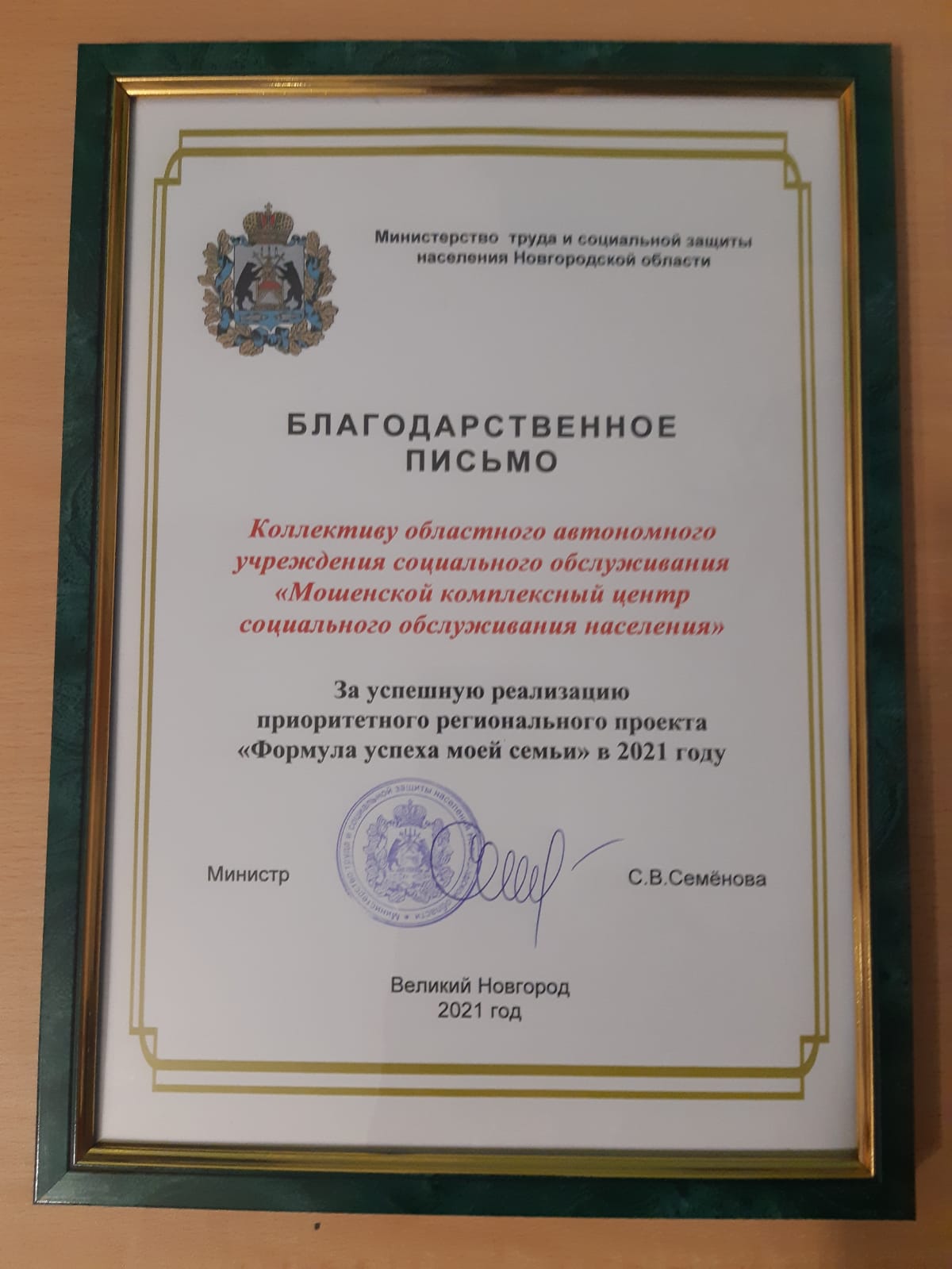 года коллективу ОАУСО «Мошенской КЦСО» вручено благодарственное письмо министерства труда и социальной защиты населения Новгородской области за успешную реализацию приоритетного регионального проекта «Формула успеха моей семьи» в 2021 году.
