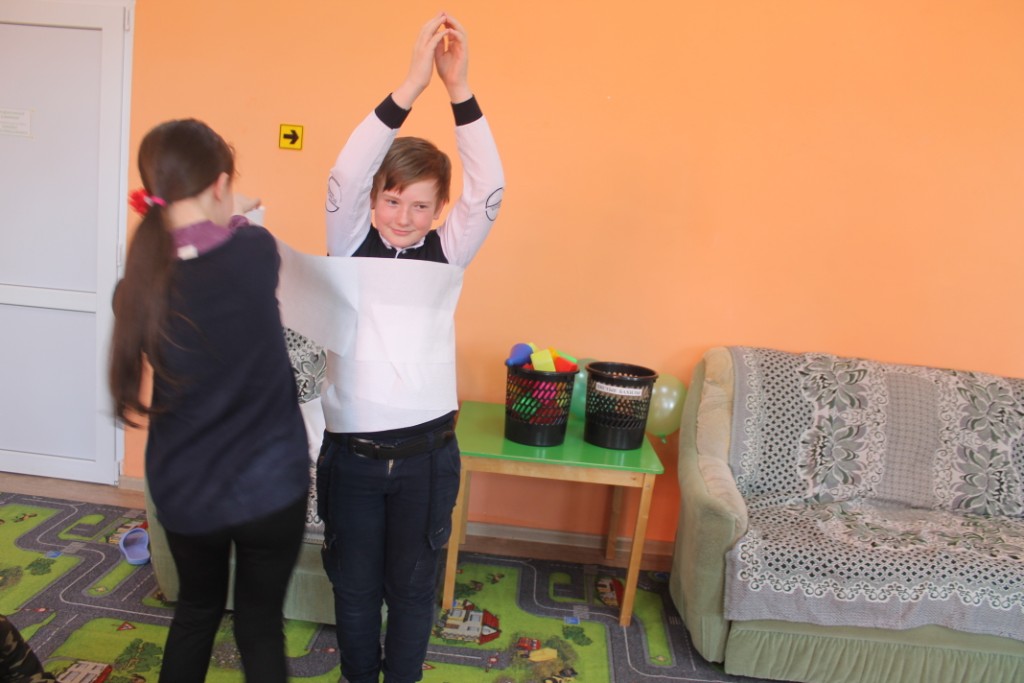 Весело и активно прошла игра среди команд «Собери космический мусор». «Строим космическую ракету», под таким названием прошел конкурс среди пар детей. По команде ведущего девочки обматывали бумажными полотенцами туловище мальчика так, чтобы получилась «ракета».