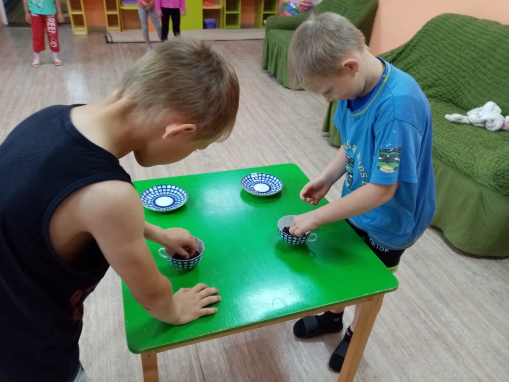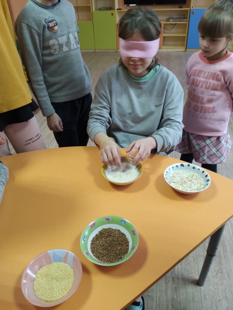 Как известно, все девочки должны быть хорошими хозяйками, уметь не только дом убрать, но и приготовить. А для этого надо знать названия продуктов, уметь их различать. Девчатам пришлось с завязанными глазами, на ощупь, определить, какая крупа насыпана на блюдцах.