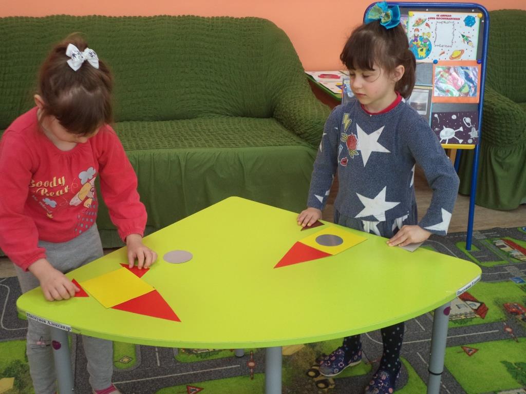 Затем строили космический корабль из геометрических фигур, проговаривая название фигуры, собирали космические звезды и многое другое. Космические испытания ребята прошли успешно, достигнув космических далей.